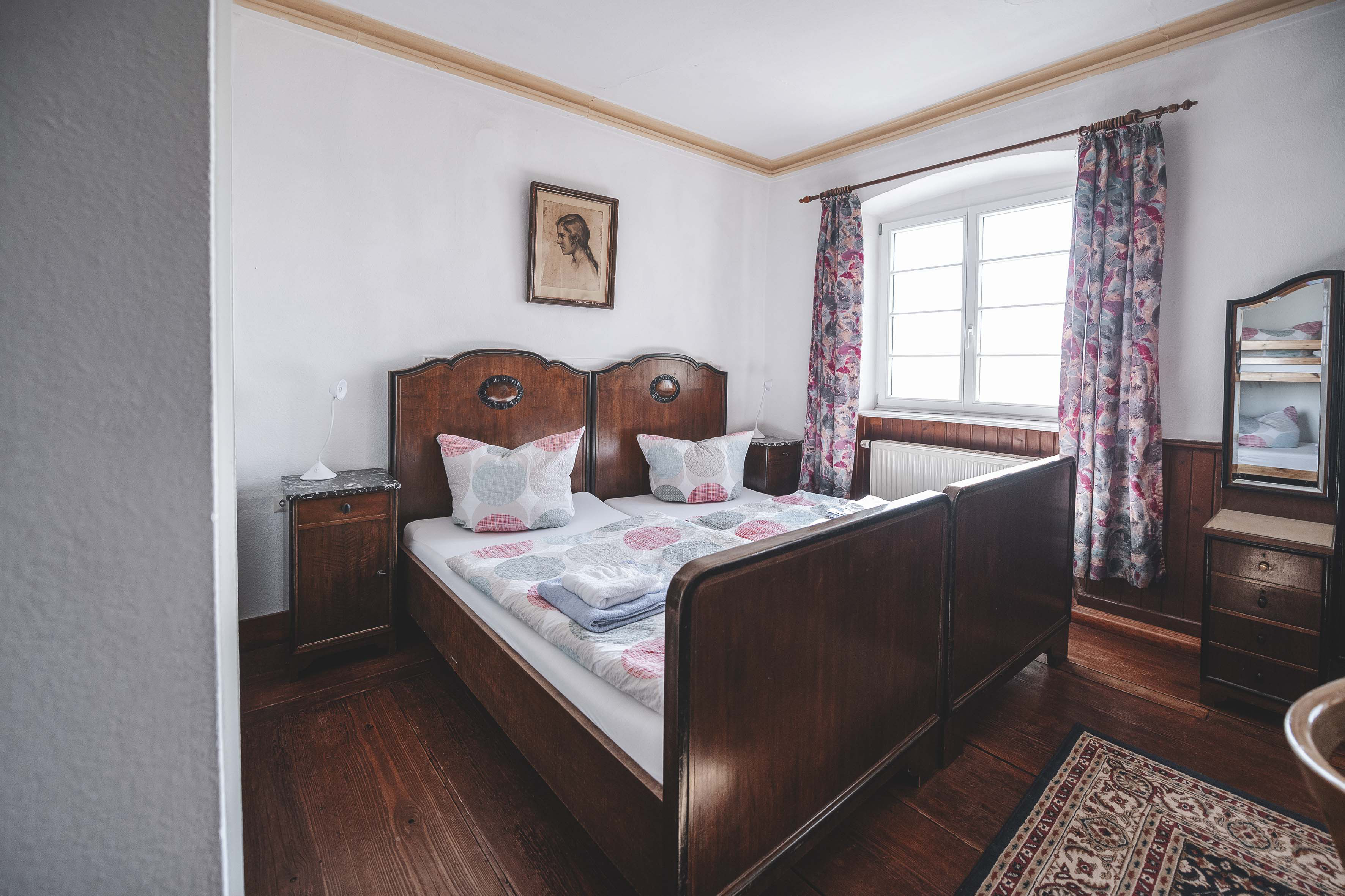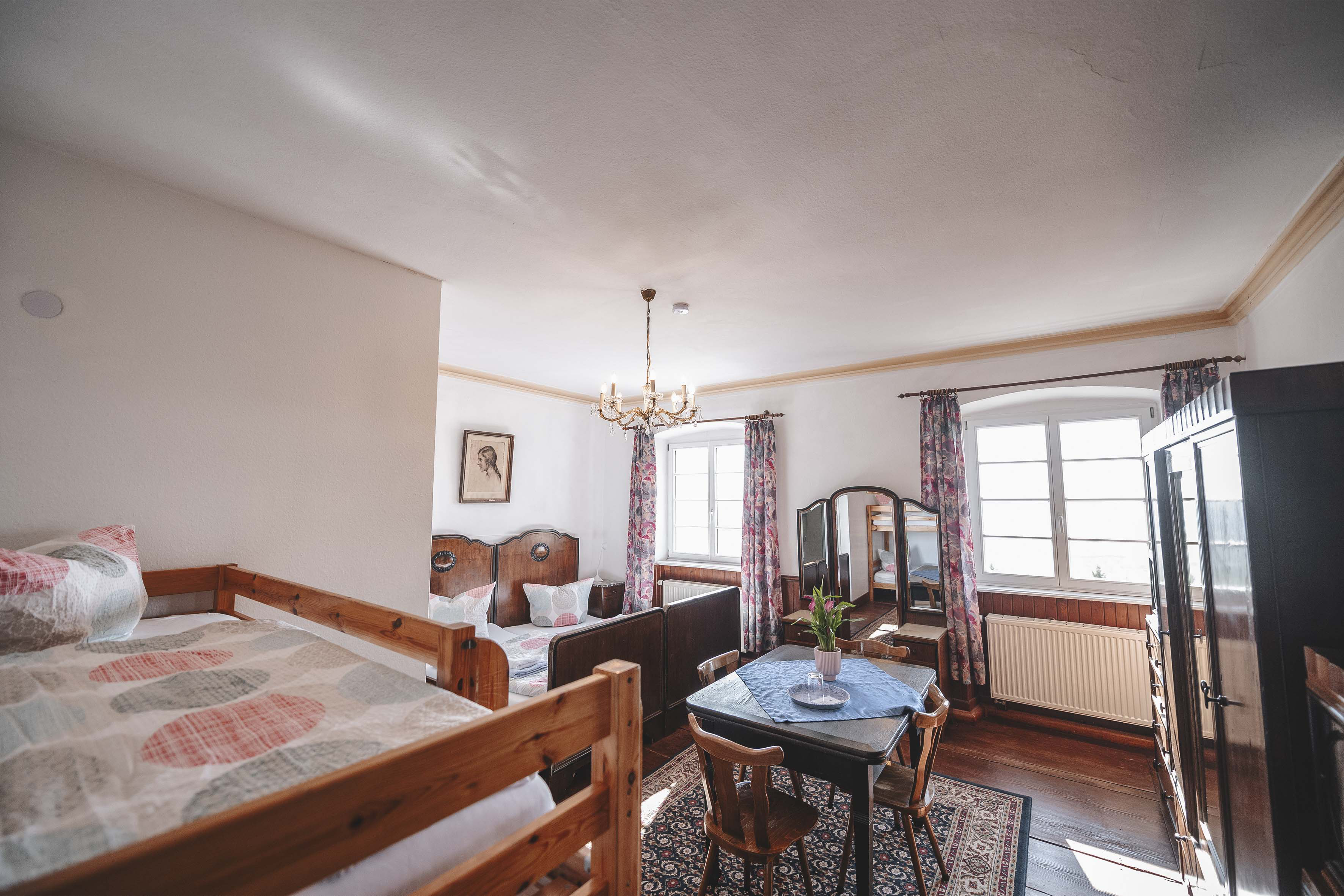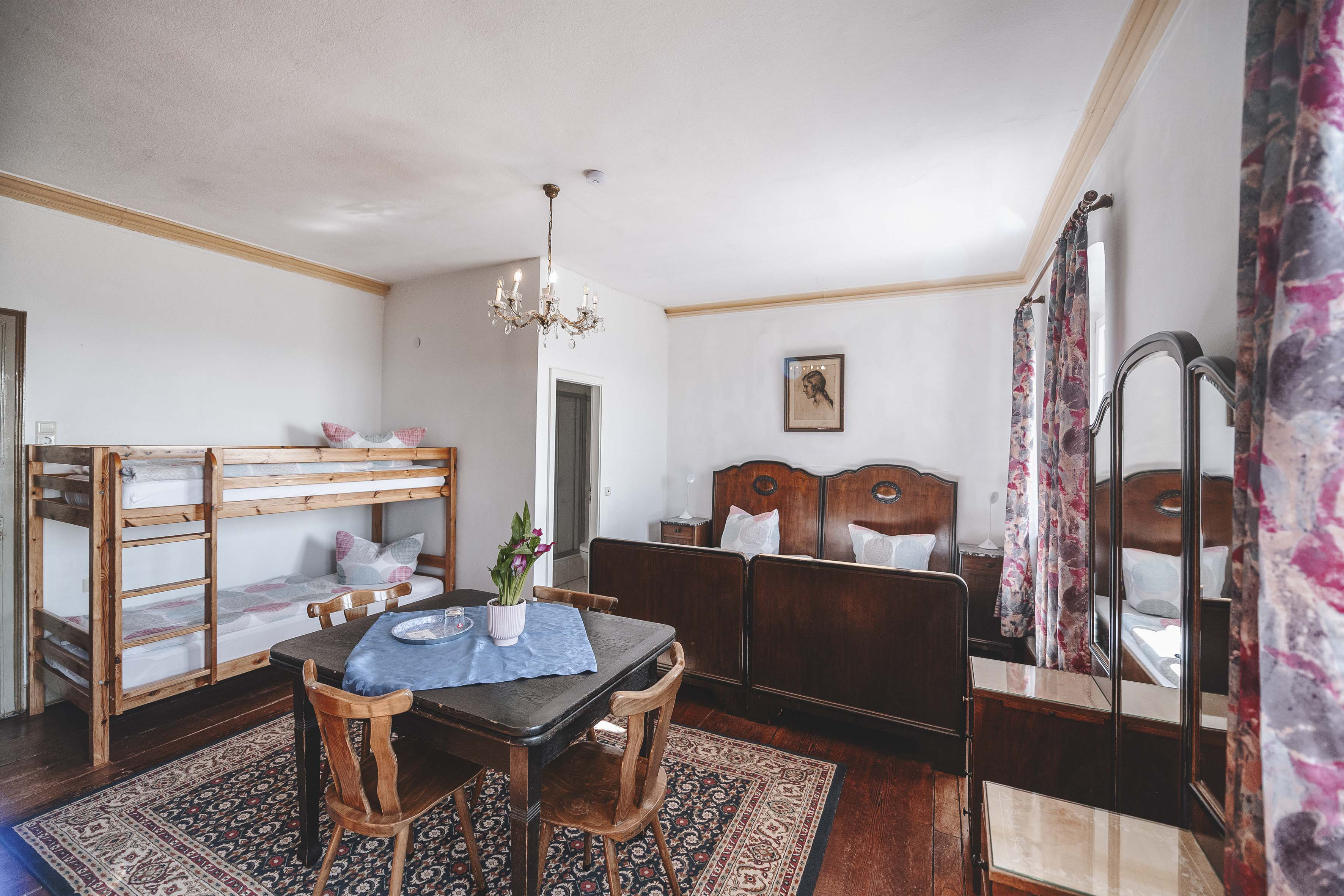 In diesem ca. 20 m² großen Einraumfamilienzimmer eingerichtet in klassischem Jugendstil befindet sich ein Doppelbett und ein Stockbett sowie ein Bad mit Dusche und WC. Das Zimmer bietet Platz für 2-4 Personen.